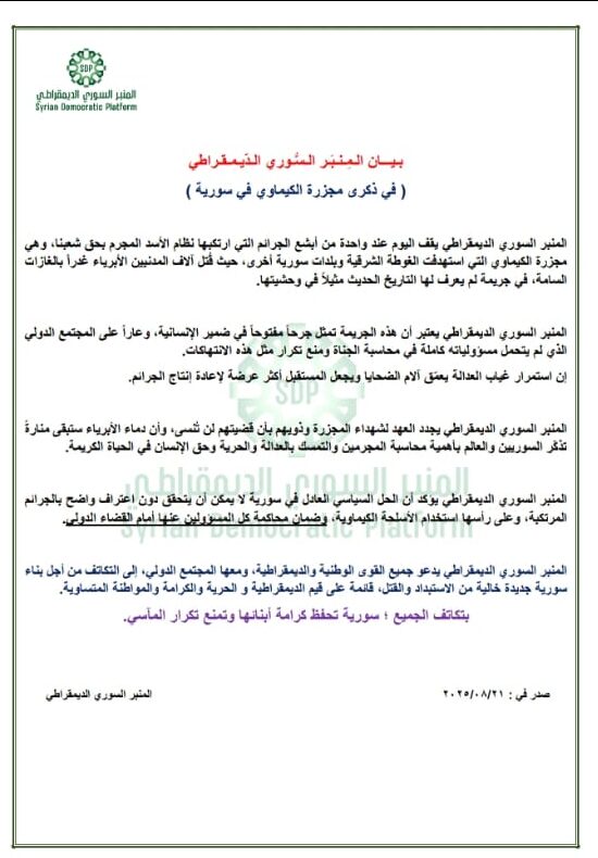 المنبر السوري الديمقراطي يعتبر أن هذه الجريمة تمثل جرحاً مفتوحاً في ضمير الإنسانية، وعاراً على المجتمع الدولي الذي لم يتحمل مسؤولياته كاملة في محاسبة الجناة ومنع تكرار مثل هذه الانتهاكات.
